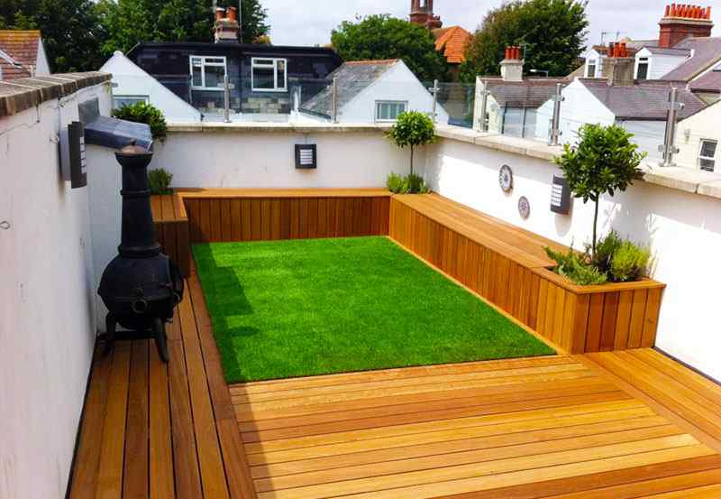 This decked-out balcony has a premium artificial lawn encircled by hardwood decking, built-in seating, and planters. Storage bins can be found in the seats that rise. Balustrading made of glass and stainless steel has been put here for safety reasons.