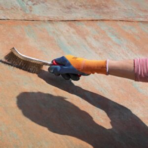 After chemical treatment, scrub the surface with a nylon brush or abrasive pad to remove converted rust. Then, wash thoroughly with baking soda and water to neutralize any remaining acid.