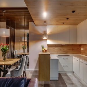 | Materials & Furniture | Metal, glass, or fabric pendant lights; LED linear fixtures; wooden, quartz, or granite island countertop |
