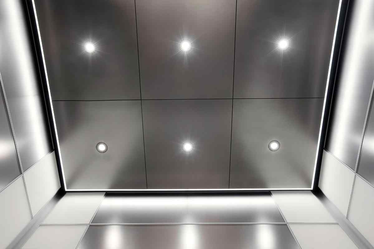 A metallic ceiling in an elevator that offers a sleek and modern look. This lift ceiling design choice is not just about aesthetics but also functionality. The reflective surface of a metallic ceiling plays a crucial role in enhancing the lighting within the elevator, creating a brighter and more inviting space. This can be particularly beneficial in elevators where lighting can often be dim and inadequate.