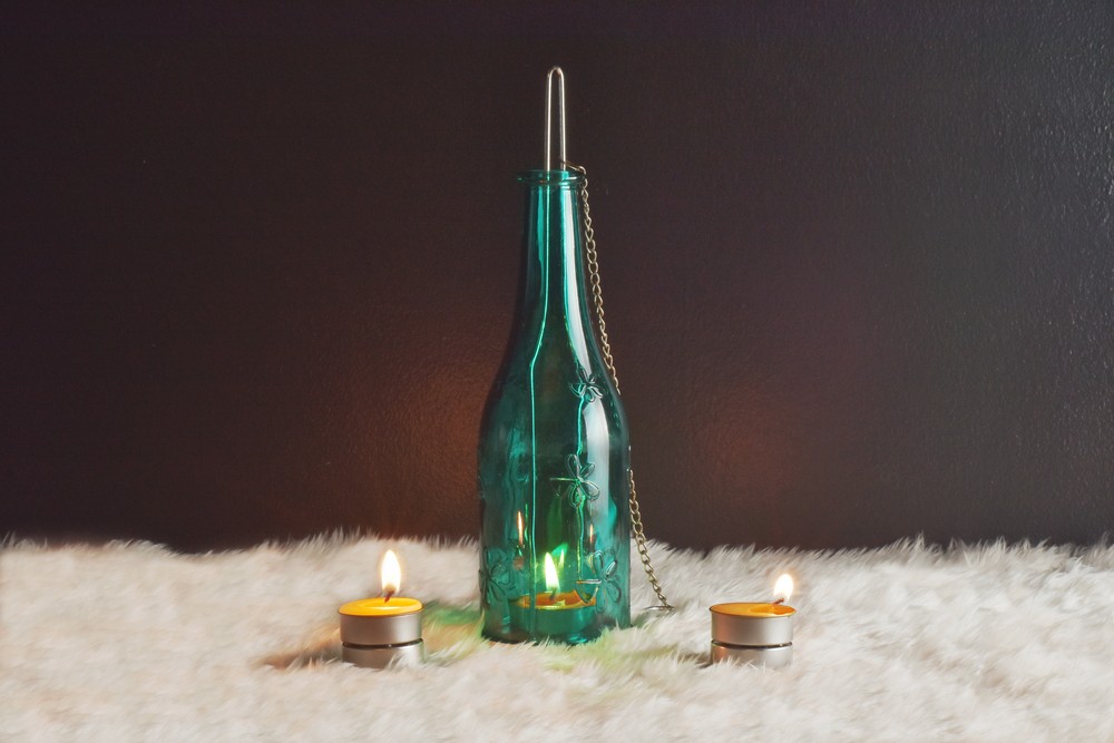 What you need: a coloured glass bottle (beer bottles work too), tea light candles and a good glass cutter.