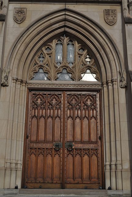 Embrace the allure of a tall dark-stained round top door, featuring pointed arches and cool metal studs. This design brings a touch of captivating Gothic architecture right to your doorstep.