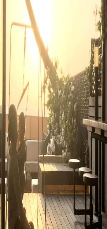 An ivory and blue throw pillow complete the overall aesthetic of the area of shahid’s Kapoor new home. The Kapoors' wooden patio is designed in a verandah. It includes a large grass-covered middle portion, a combination of high and low seating, and ivory and blue cushions to complete the overall look. Natural features such as potted plants and flowers are combined with a sleek and contemporary design to create a quiet outside hideaway that is congruent with the rest of the property.