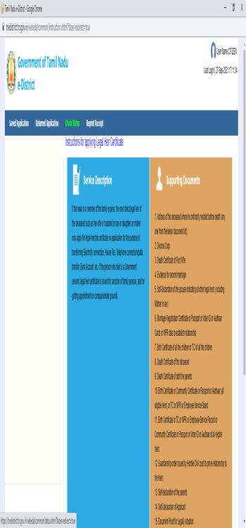 - You can click the “Check Status” button to view the current status of the legal heir certificate in Tamil Nadu.