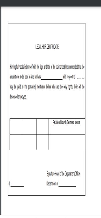 The certificate contains a full declaration regarding confirmation of the legal heirs. It also mentions the arrears or amount to be paid to the legal heirs of the deceased employee. In addition, a small box saying the heirs and their relationship with the dead person is also on this certificate. Finally, the date and Signature of the Departmental Head/Office are present.
