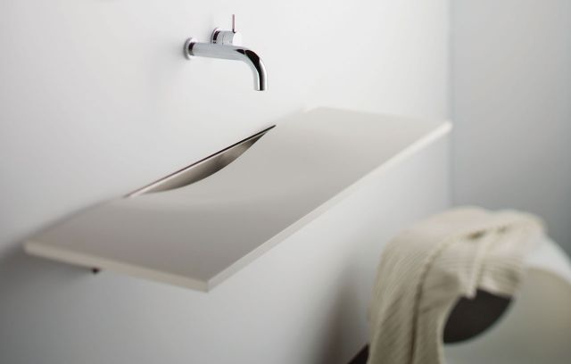This minimal Wash plane sink is a simple washbasin design for small bathrooms since it takes very little space. Given an equally minimal mirror, the sink-mirror unit combination can make for a sure-shot winner.