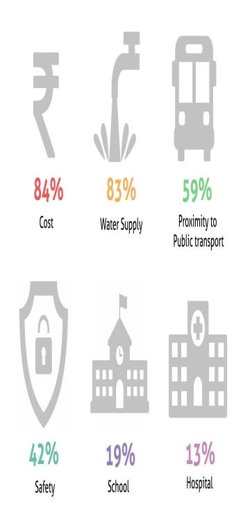 The cost of a home is the most important factor for those looking at homes. They often set a budget first, and then start their search for a new home. From our survey and customer data we see that 84% of an individual’s decision is based on cost when it comes to choosing a new house to live in.