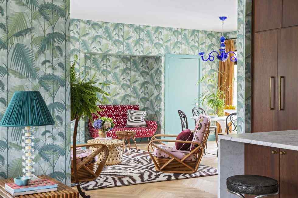 If you have an affinity for art, be sure to check this design by South Carolina designer Angie Hranowsky where she flexes her creative muscles with a plethora of playful colours and wallpapers. Using wallpaper in such an expansive way can also make for great 2 BHK flat interior design photos. In fact, given the low cost of wallpapers, this inspiration is well-suited for a low budget kitchen 2 BHK flat interior design, as it also protects the wall.